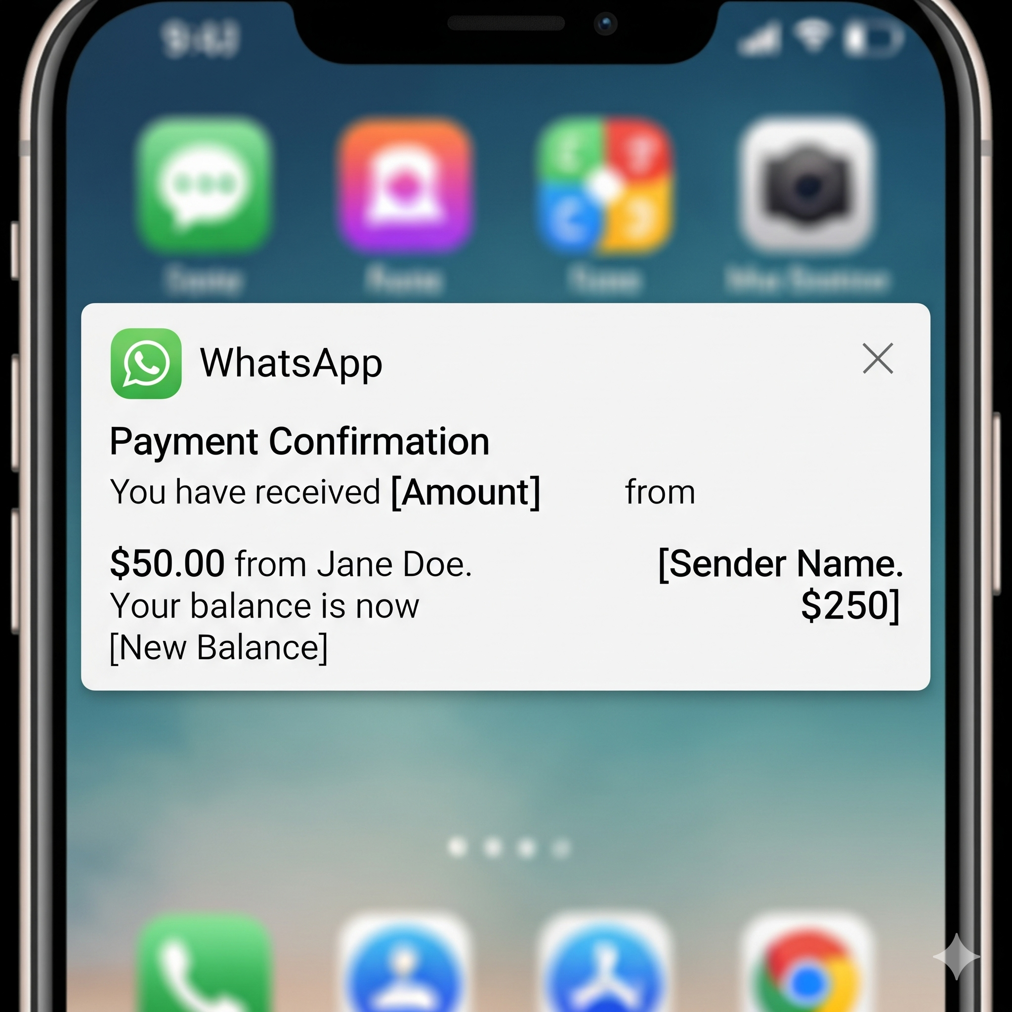 Setiap kali ada transaksi yang berhasil, Anda akan menerima pemberitahuan real-time langsung di WhatsApp Anda. Ini sangat berguna untuk bisnis online atau ketika Anda tidak di depan aplikasi, memastikan Anda tidak melewatkan pembayaran apa pun.